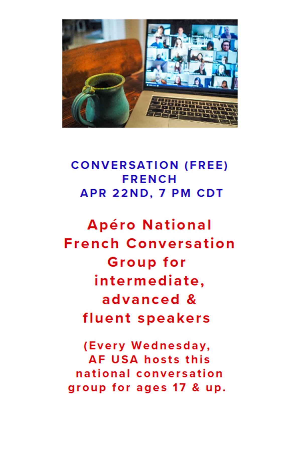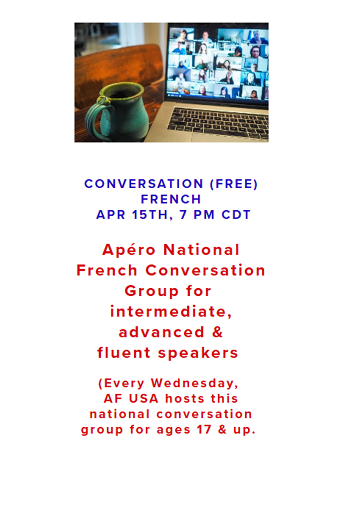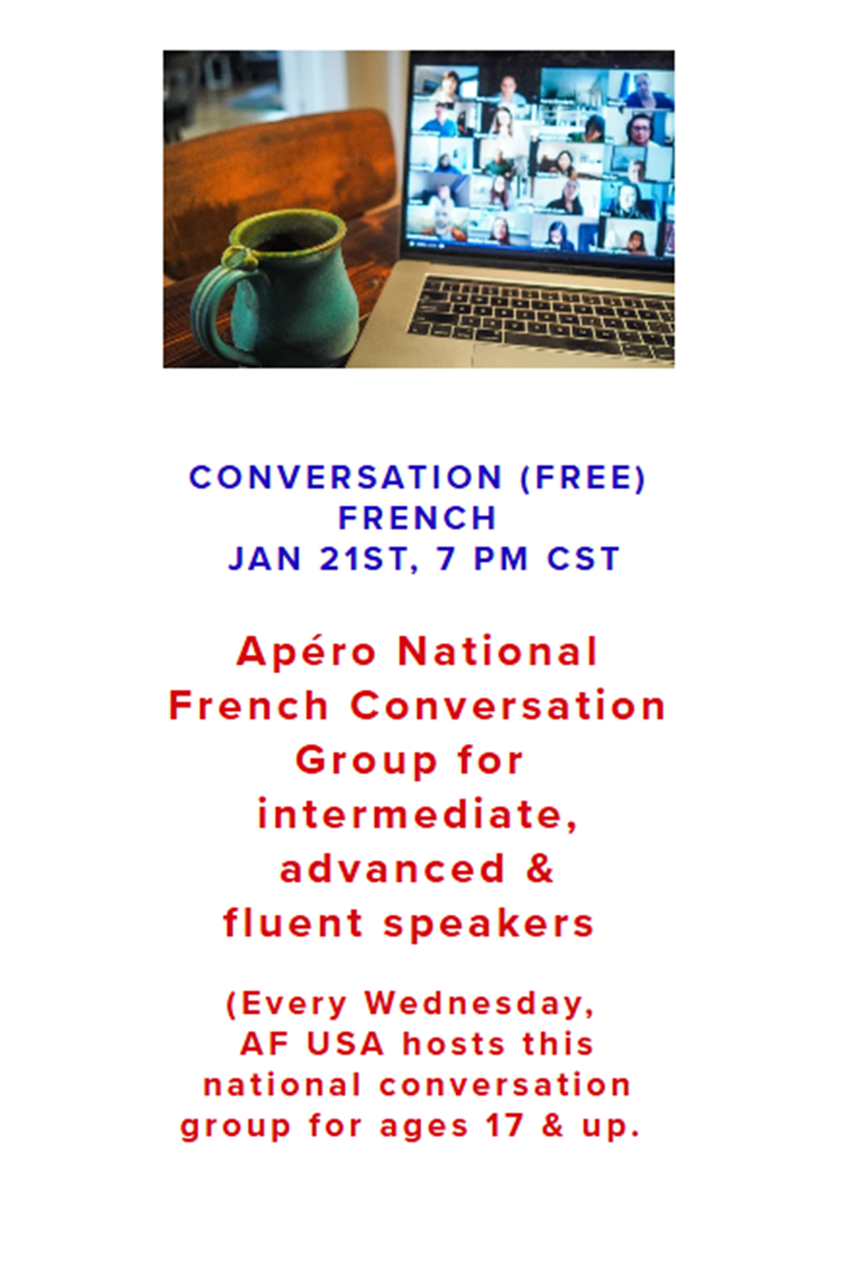 Members of Alliance Française d'Oklahoma City have access to a wide variety of online Alliance Française events from across the globe. Most of these events are held over Zoom.