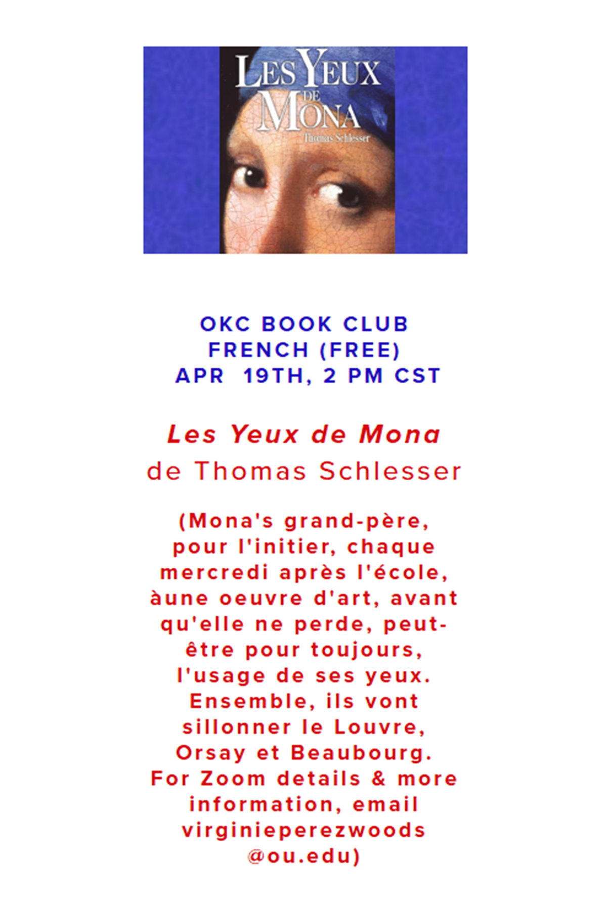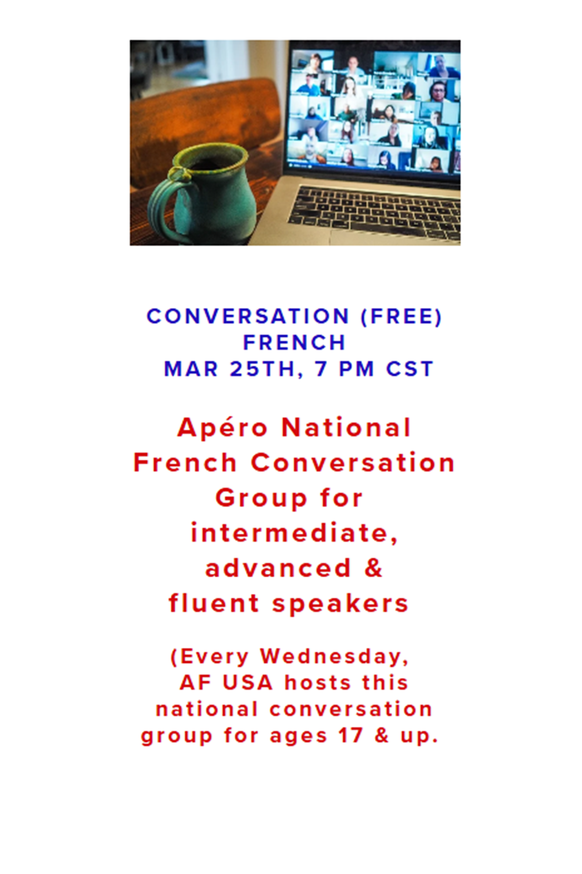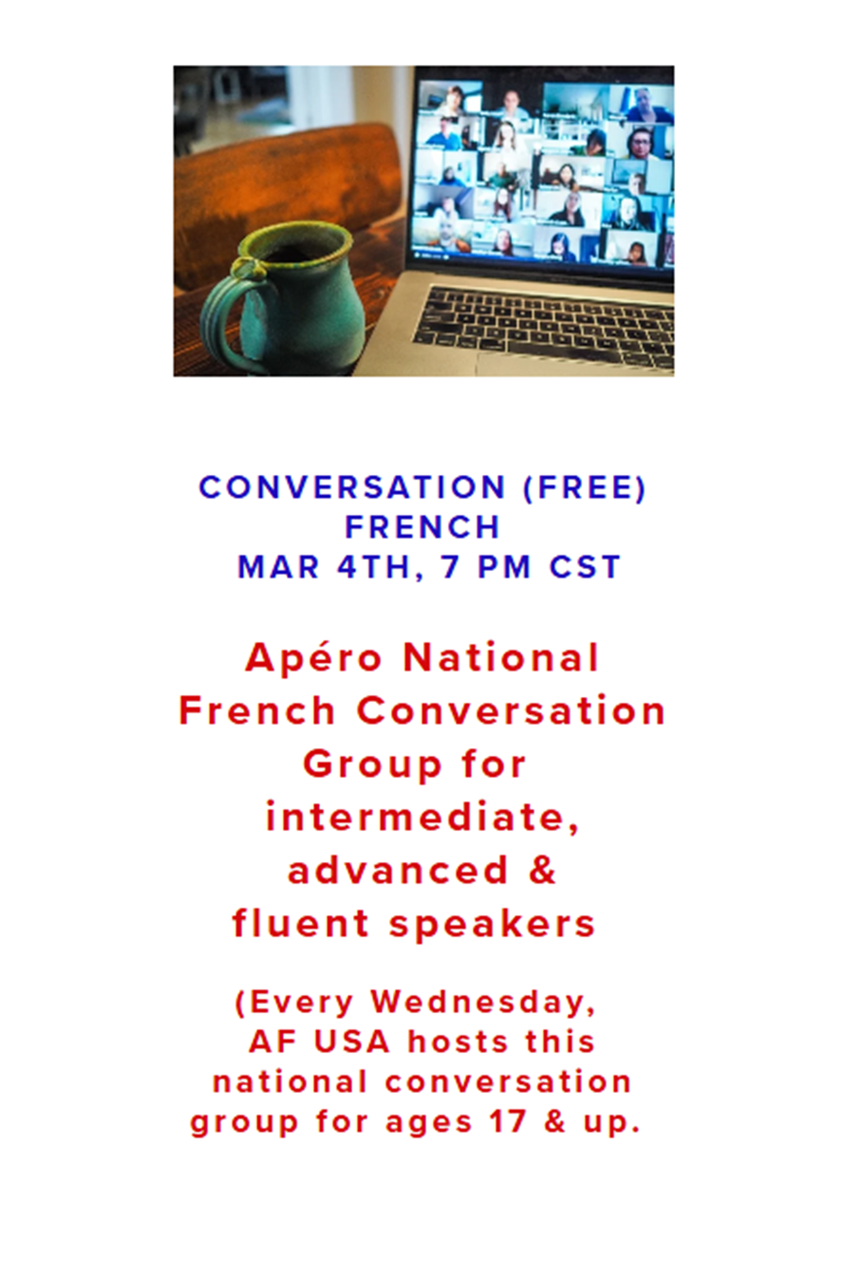 Members of Alliance Française d'Oklahoma City have access to a wide variety of online Alliance Française events from across the globe. Most of these events are held over Zoom.